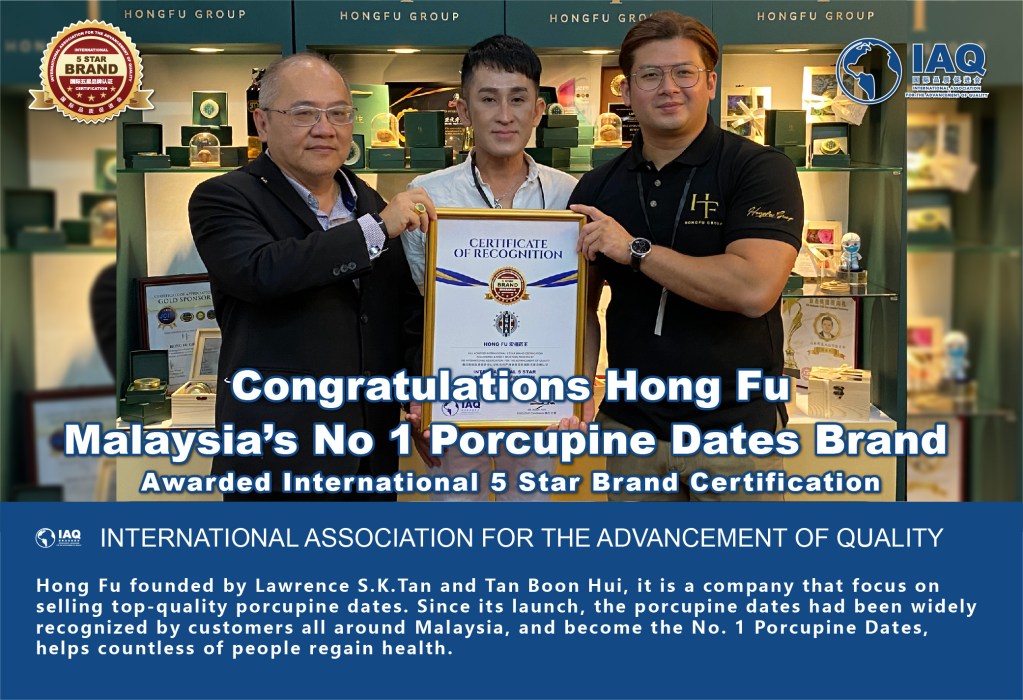 Hong Fu founded by Lawrence S.K.Tan and Tan Boon Hui, it is a company that focus on selling top-quality porcupine dates. Since its launch, the porcupine dates had been widely recognized by customers all around Malaysia, and become the No. 1 Porcupine Dates, helps countless of people regain health. Hence, due to the excellent brand and product quality, Hong Fu has been reviewed and recognized by International Association for the Advancement Quality (IAQ), and awarded by IAQ Executive Chairman Dr. Robin at Sunway Convention Centre Malaysia Health and Wellness Fair 2022.